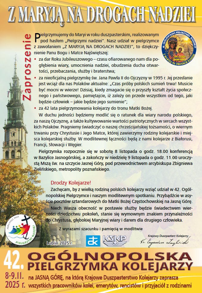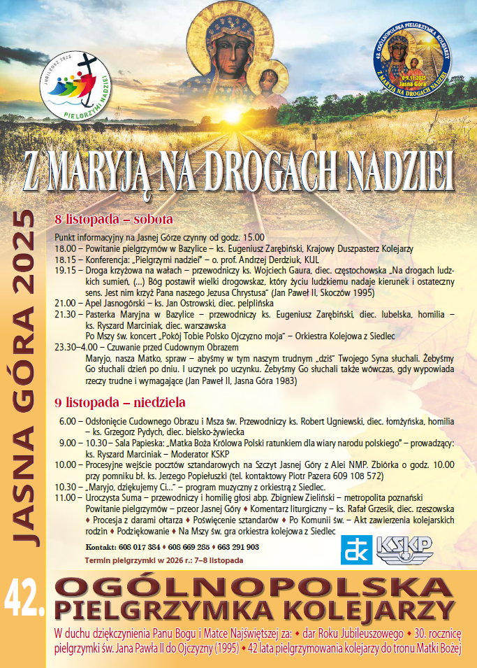 Pielgrzymka odbyła się w dniach 8-9 listopada 2025 r. i była organizowana przez Krajowe Duszpasterstwo Kolejarzy. Tegoroczne wydarzenie odbywało się pod hasłem "Z MARYJĄ NA DROGACH NADZIEI", a jego celem było duchowe dziękczynienie Panu Bogu i Matce Najświętszej: