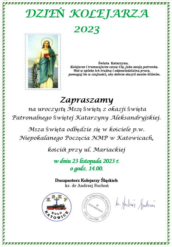 Katolickie Stowarzyszenie Kolejarzy Polskich koło Katowice przygotowuje się przez 33 dni od 5 listopada do 8 grudnia 2023 r.