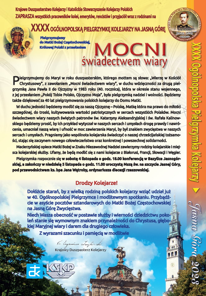 II. Poniżej umieszczamy program pielgrzymki i zaproszenie do rozpropagowania informacji w swoich ośrodkach, parafiach, mediach itp. (drogą pocztową zostały wysłane do kół KSKP i ośrodków duszpasterskich oraz do duszpasterzy kolejarzy).